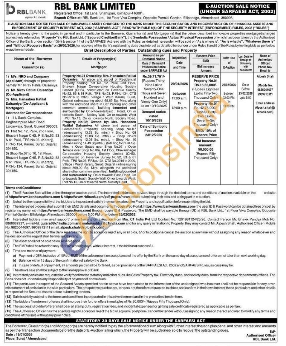 Property No.02: Owned by: Mrs. Hansaben Ratilal Dalsaniya All piece and parcel of Commercial Property bearing Shop No.07 (admeasuring 12.08 Sq. mtrs.) (admeasuring 13.29 Sq. mtrs.) Shop No. 08 Shop No.09 (admeasuring 12.08 Sq. mtrs.). Shop No. 10 (admeasuring 1-4.49 Sq mtrs.), (totalling to 51.94 Sq. Mtrs. Open Space near Shop No.07 Open Terrace over Shop No.06), 1st Floor. Bhavaninagar Co-operative Housing Society Limited (CHS). constructed on Revenue Survey No.52, 53 & 61 Paiki, TPS No. 03. F.P No. 134, CTS No. 2916 to 2920 Village/Ward Karanj, Surat, Gujarat (admeasuring about 559.00 Sq. Mtrs. alongwith the undivided share other common amenities), building bounded and surrounded by: On or towards East: Road, On or towards South: Society Wall, On or towards West: Plot No. 13. On or towards North: Society Road