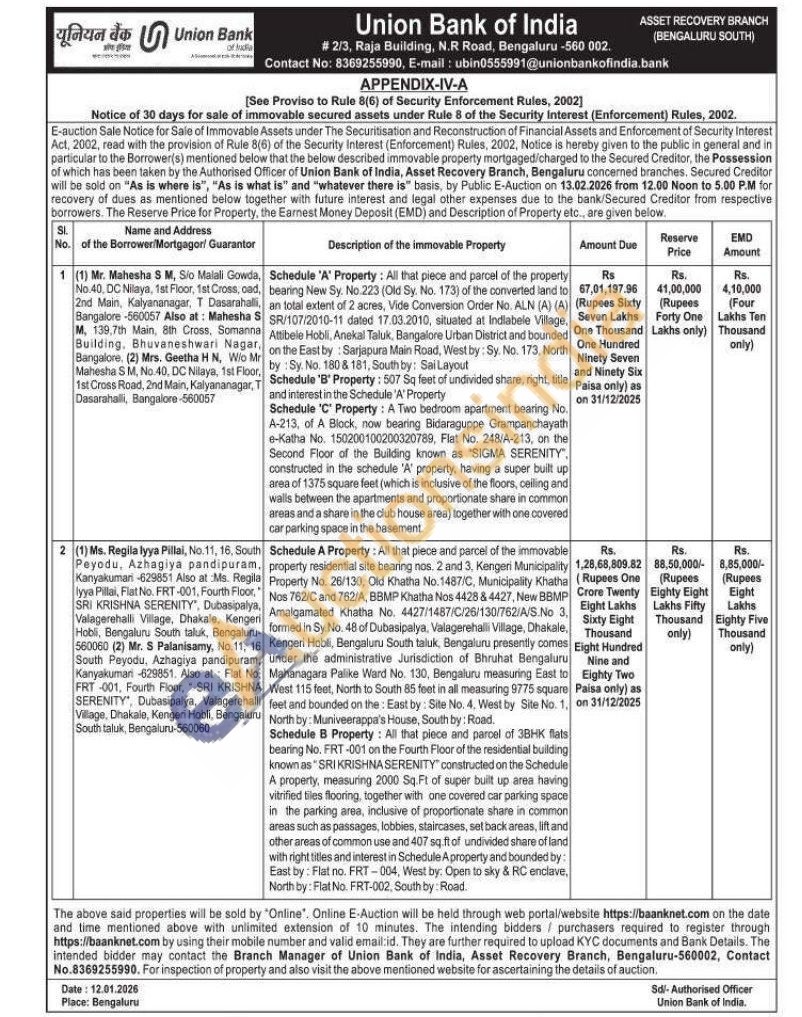 Schedule A Property: All that piece and parcel of the immovable property residential site bearing nos. 2 and 3, Kengeri Municipality Property No. 28/130, Old Khatha No. 1487/C, Municipality Khatha Nos 762/C and 762/A, BBMP Khatha Nos 4428 & 4427, New BBMP Amalgamated Khatha No. 4427/1487/C/26/130/762/A/S.No 3. formed in Sy. No. 48 of Dubasipalya, Valagerehalli Village, Dhakale, Kengeri Hobili, Bengaluru South taluk, Bengaluru presently comes to under the administrative Jurisdiction of Bhruhat Bengaluru Mahanagara Palike Ward No. 130, Bengaluru measuring East West 115 feet, North to South 85 feet in all measuring 9775 square feet and bounded on the East by: Site No. 4, West by Site No. 1, North by: Muniveerappa's House, South by: Road. Schedule B Property: All that piece and parcel of 3BHK flats bearing No. FRT-001 on the Fourth Floor of the residential building known as SRI KRISHNA SERENITY constructed on the Schedule A property, measuring 2000 Sq.Ft of super built up area having vitrified tiles flooring, together with one covered car parking space in the parking area, inclusive of proportionate share in common areas such as passages, lobbies, staircases, set back areas, lift and other areas of common use and 407 sq.ft of undivided share of land with right titles and interest in Schedule A property and bounded by: East by: Flat no. FRT-004, West by: Open to sky & RC enclave, North by: Flat No. FRT-002, South by: Road.