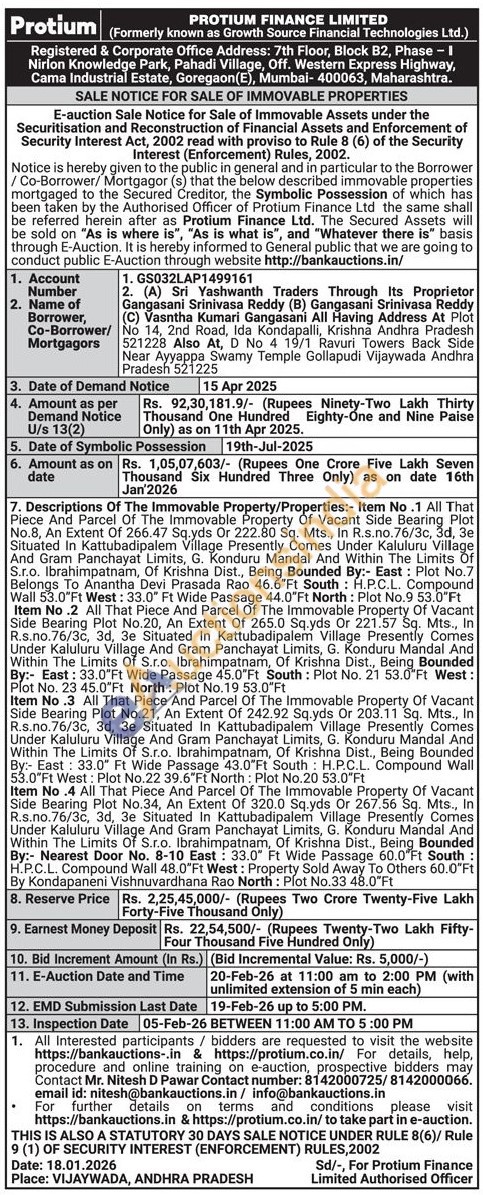 Descriptions Of The Immovable Property/Properties:- Item No.1 All That Piece And Parcel Of The Immovable Property Of Vacant Side Bearing Plot No.8, An Extent Of 266.47 Sq.yds Or 222.80 Sq. Mts., In R.s.no.76/3c, 3d, 3e Situated In Kattubadipalem Village Presently Comes Under Kaluluru Village And Gram Panchayat Limits, G. Konduru Mandal And Within The Limits S.r.o. Ibrahimpatnam, Of Krishna Dist., Being Bounded By:- East: Plot No.7 Belongs To Anantha Devi Prasada Rao 46.6"Ft South: H.P.C.L. Compound Wall 53.0 Ft West: 33.0" Ft Wide Passage 44.0"Ft North: Plot No.9 53.0"Ft Item No.2 All That Piece And Parcel Of The Immovable Property Of Vacant Side Bearing Plot No.20, An Extent Of 265.0 Sq.yds Or 221.57 Sq. Mts., is, In R.s.no.76/3c, 3d, 3e Situated In Kattubadipalem Village Presently Comes Under Kaluluru Village And Gram Panchayat Limits, G. Konduru Mandal And Within The Limits Of S.r.o. Ibrahimpatnam, Of Krishna Dist., Being Bounded By: East: 33.0"Ft Wide Passage 45.0"Ft South: Plot No. 21 53.0 Ft West: Plot No. 23 45.0"Ft North: Plot No.19 53.0 Ft