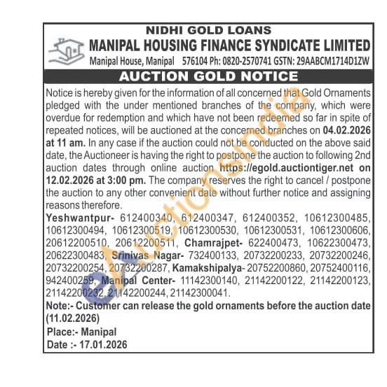 MANIPAL HOUSING FINANCE SYNDICATE LIMITED Gold Auctions Auction in Bengaluru