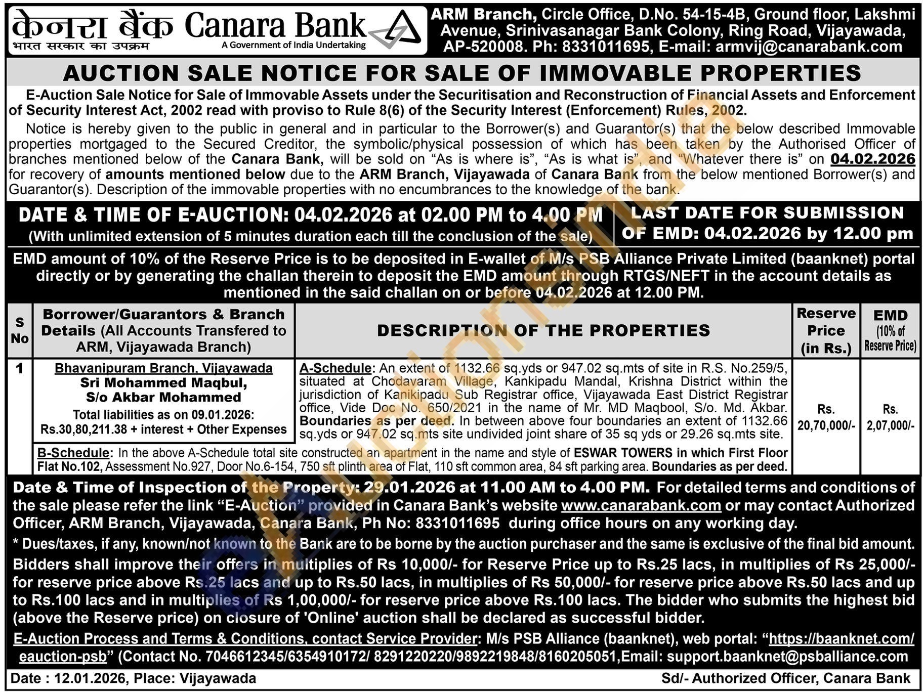 A-Schedule: An extent of 1132.66 sq.yds or 947.02 sq.mts of site in R.S. No.259/5, situated at Chodavaram Village, Kankipadu Mandal, Krishna District within the jurisdiction of Kanikipadu Sub Registrar office, Vijayawada East District Registrar office, Vide Doc No. 650/2021 in the name of Mr. MD Maqbool, S/o. Md. Akbar. Boundaries as per deed. In between above four boundaries an extent of 1132.66 sq.yds or 947.02 sq.mts site undivided joint share of 35 sq yds or 29.26 sq.mts site.B-Schedule: In the above A-Schedule total site constructed an apartment in the name and style of ESWAR TOWERS in which First Floor Flat No.102, Assessment No.927, Door No.6-154, 750 sft plinth area of Flat, 110 sft common area, 84 sft parking area. Boundaries as per deed.