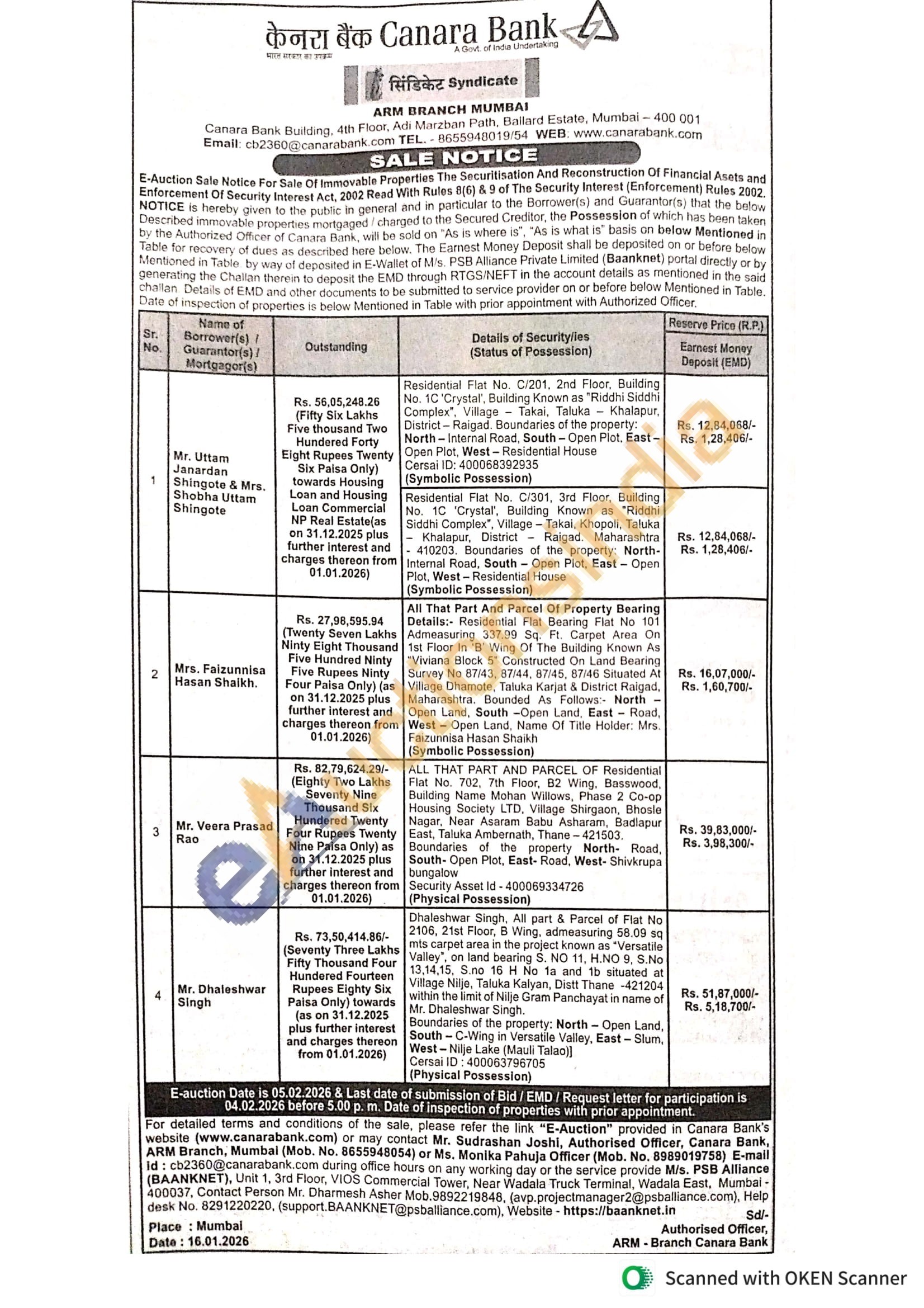 Contact Mr. Sudrashan Joshi, Authorised Officer, Canara Bank, ARM Branch, Mumbai (Mob. No. 8655948054) or Ms. Monika Pahuja Officer (Mob. No. 8989019758)