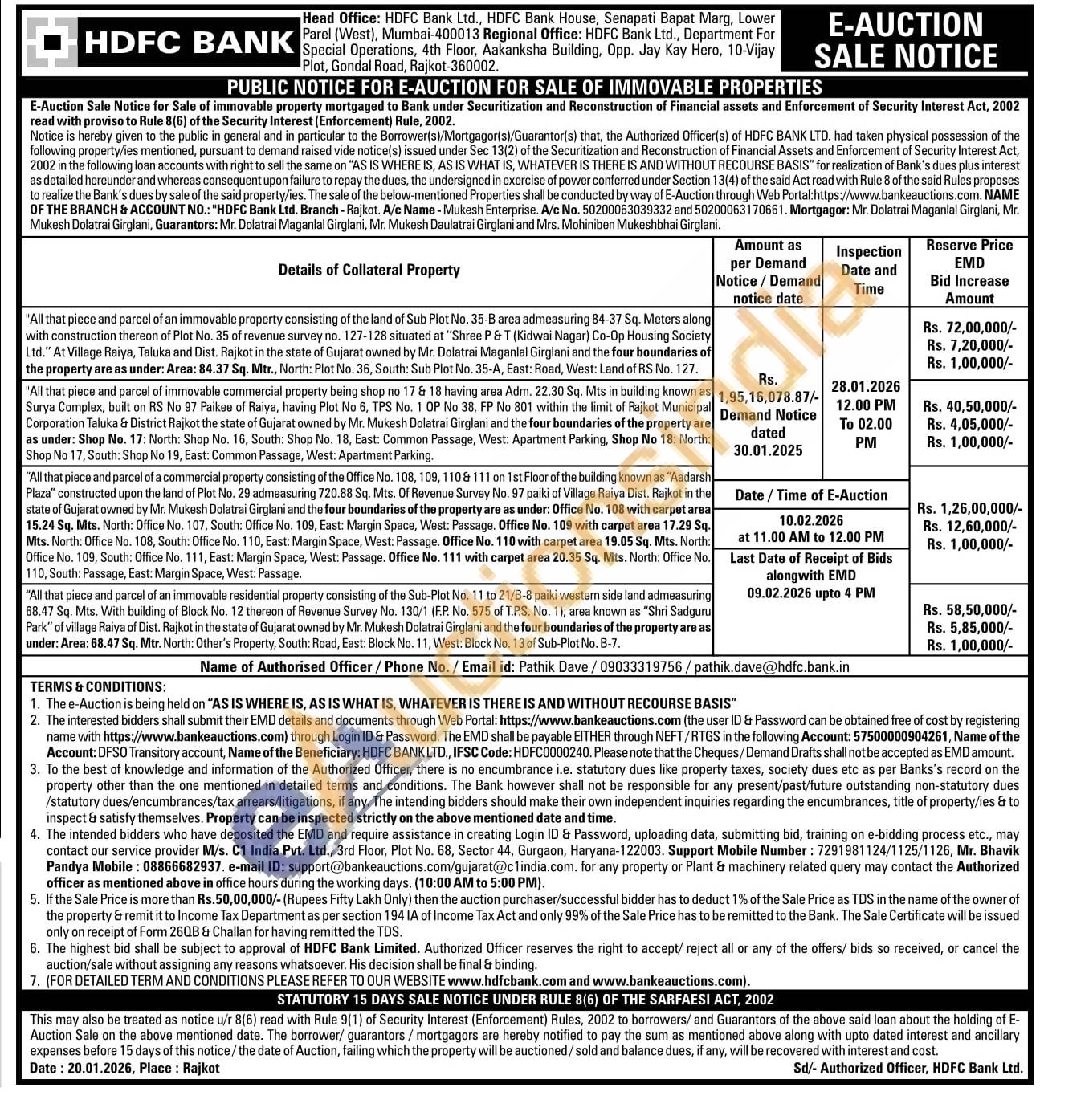 "All that piece and parcel of a commercial property consisting of the Office No. 108, 109, 1108 111 on 1st Floor of the building known as "Aadarsh Plaza" constructed upon the land of Plot No. 29 admeasuring 720.88 Sq. Mts. Of Revenue Survey No. 97 paiki of Village Raiya Dist. Rajkot in the state of Gujarat owned by Mr. Mukesh Dolatrai Girglani and the four boundaries of the property are as under: Office No. 108 with carpet area 15.24 Sq. Mts. North: Office No. 107, South: Office No. 109, East: Margin Space, West: Passage. Office No. 109 with carpet area 17.29 Sq. Mts. North: Office No. 108, South: Office No. 110, East: Margin Space, West: Passage. Office No. 110 with carpet area 19.05 Sq. Mts. North: Office No. 109, South: Office No. 111, East: Margin Space, West: Passage. Office No. 111 with carpet area 20.35 Sq. Mts. North: Office No. 110, South: Passage, East: Margin Space, West: Passage.
