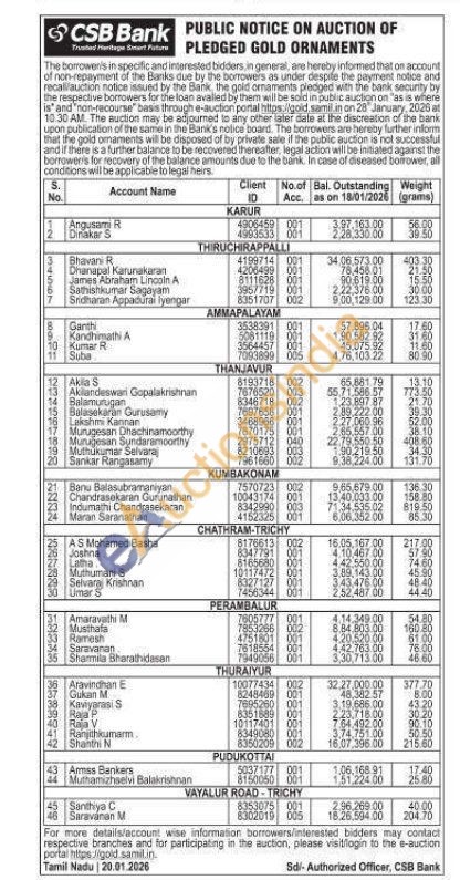 CSB Bank Gold Auctions Auction in Karur