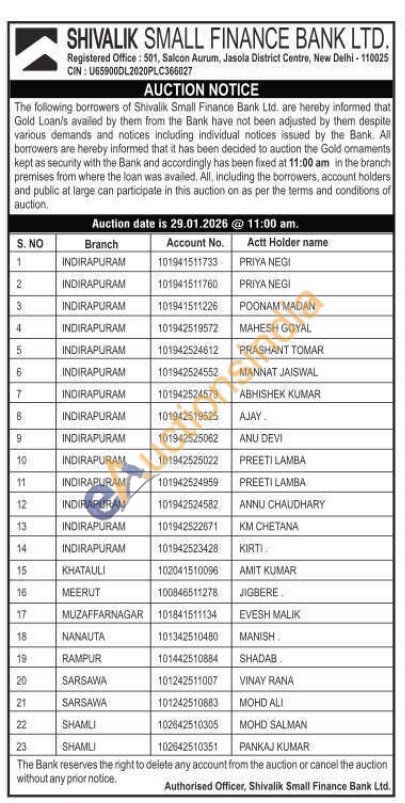 Shivalik Small Finance Bank Ltd Gold Auctions Auction in New Delhi