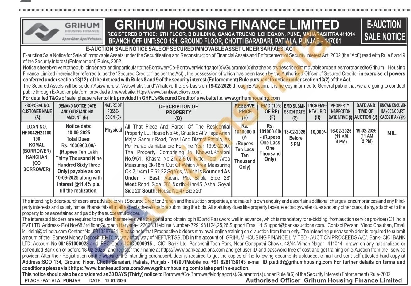 All That Piece And Parcel Of The Residential Property I.E. House No.46, Situated At Village Arian Majra Sanour Road, Tehsil And District Patiala, As Per Farad Jamabandie For The Year 1999-2000, The Property Comprising In Khewat/Khatoni No.9/51, Khasra No.21//2(8-0) Kittel Total Area Measuring 9k-18m Out Of Which Area Measuring Ok-2.1/4m I.E 62.22 Sq Yds, Which Is Bounded As Under: East: Vacant Plot Bhola Side 28' West:Road Side 28' North:-Hno45 Asha Goyal Side 20' South: House No.47 Side 20