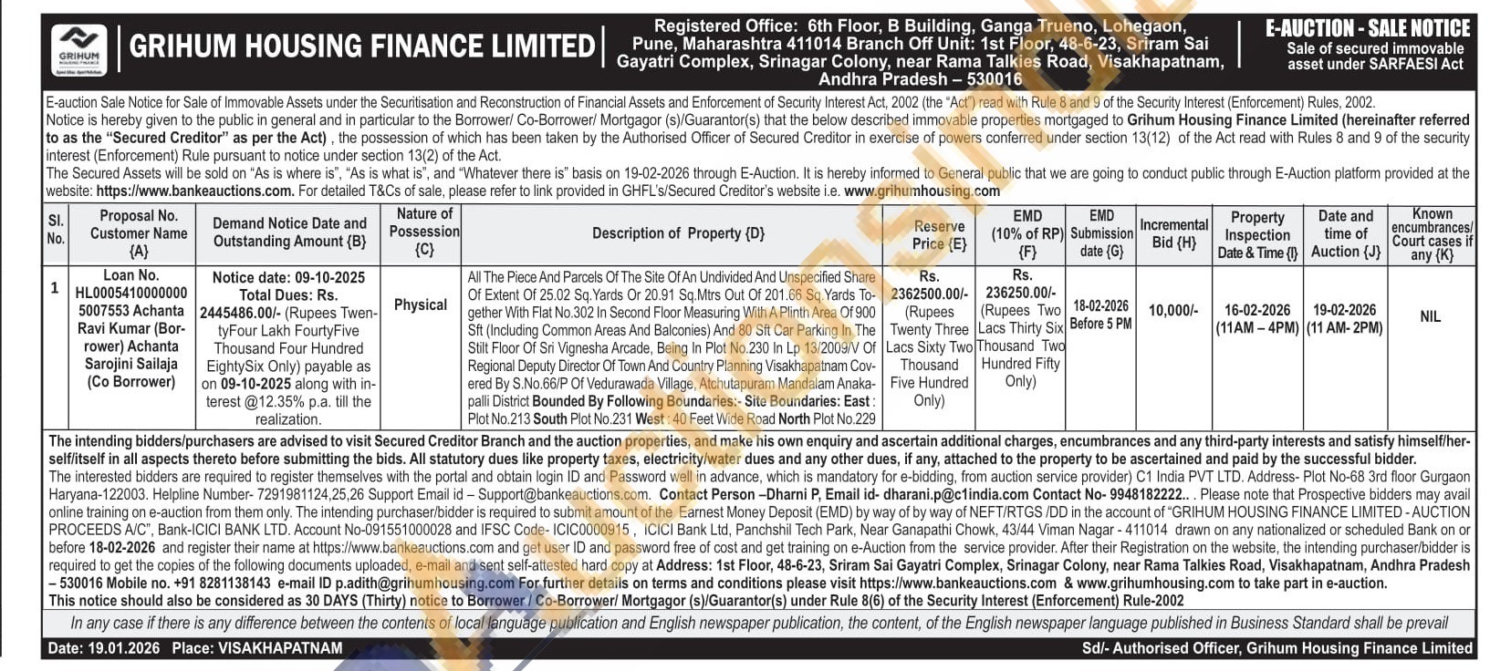 All The Piece And Parcels Of The Site Of An Undivided And Unspecified Share Of Extent Of 25.02 Sq. Yards Or 20.91 Sq.Mtrs Out Of 201.66 Sq. Yards To-gether With Flat No.302 In Second Floor Measuring With A Plinth Area Of 900 Sft (Including Common Areas And Balconies) And 80 Sft Car Parking In The Stilt Floor Of Sri Vignesha Arcade, Being In Plot No.230 in Lp 13/2009/V Of Regional Deputy Director Of Town And Country Planning Visakhapatnam Cov ered By S.No.66/P Of Vedurawada Village, Atchutapuram Mandalam Anaka-pali District Bounded By Following Boundaries:- Site Boundaries: East Plot No.213 South Plot No. 231 West: 40 Feet Wide Road North Plot No.229