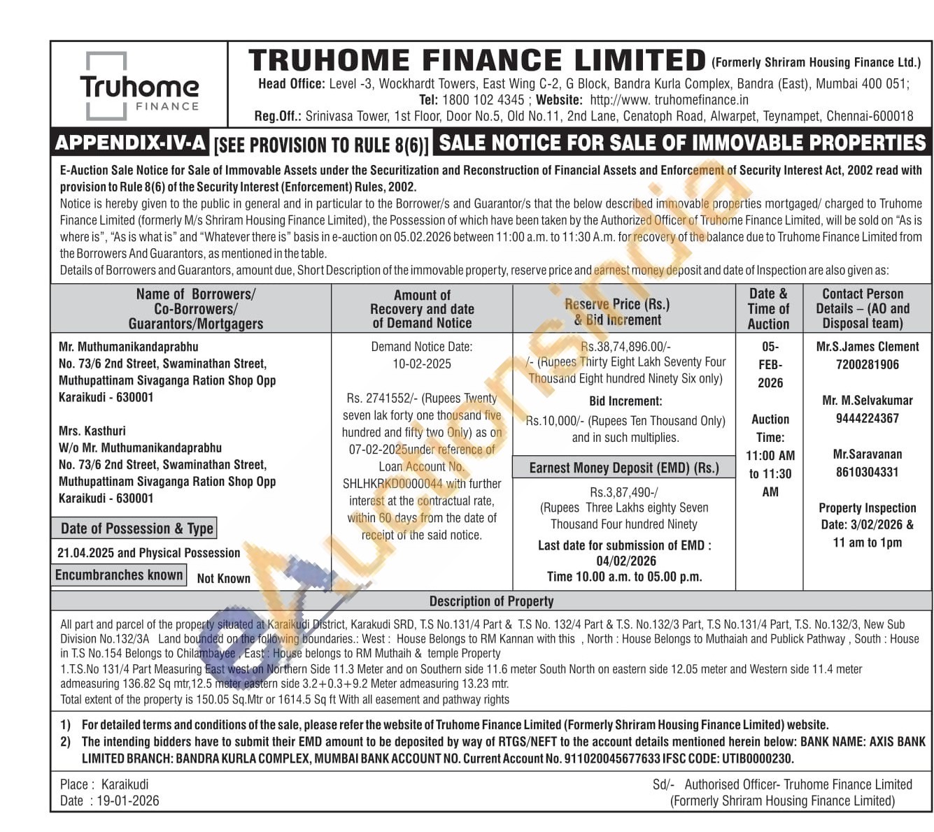 All part and parcel of the property situated at Karaikudi District, Karakudi SRD, T.S No. 131/4 Part & T.S No. 132/4 Part & T.S. No. 132/3 Part, T.S No. 131/4 Part, T.S. No. 132/3, New Sub Division No. 132/3A Land bounded on the following boundaries.: West House Belongs to RM Kannan with this, North House Belongs to Muthaiah and Publick Pathway, South: House in T.S No.154 Belongs to Chilambayee, East House belongs to RM Muthaih & temple Property 1.T.S.No 131/4 Part Measuring East west on Northern Side 11.3 Meter and on Southern side 11.6 meter South North on eastern side 12.05 meter and Western side 11.4 meter admeasuring 136.82 Sq mtr, 12.5 meter eastern side 3.2+0.3+9.2 Meter admeasuring 13.23 mtr. Total extent of the property is 150.05 Sq.Mtr or 1614.5 Sq ft With all easement and pathway rights