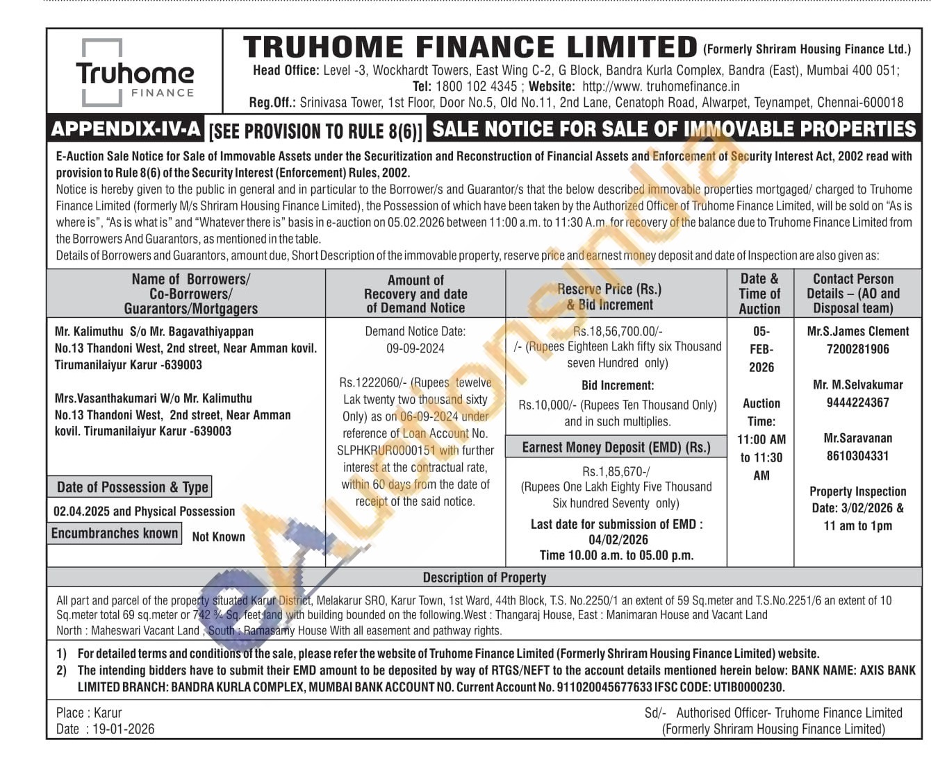 All part and parcel of the property situated Karur District, Melakarur SRO, Karur Town, 1st Ward, 44th Block, T.S. No.2250/1 an extent of 59 Sq.meter and T.S.No.2251/6 an extent of 10 Sq.meter total 69 sq.meter or 742% Sq. feet land with building bounded on the following. West: Thangaraj House, East: Manimaran House and Vacant Land North: Maheswari Vacant Land, South: Ramasamy House With all easement and pathway rights.