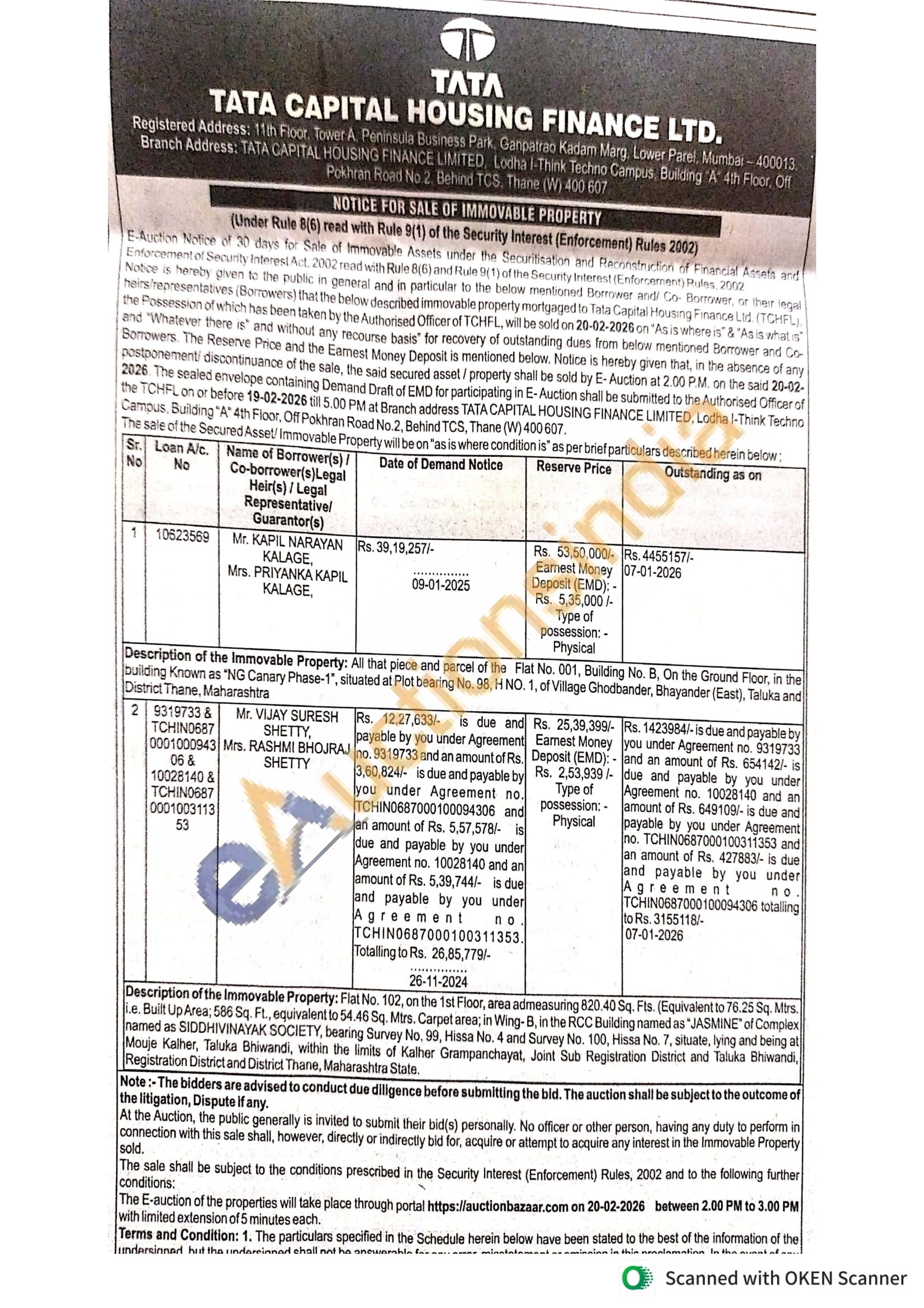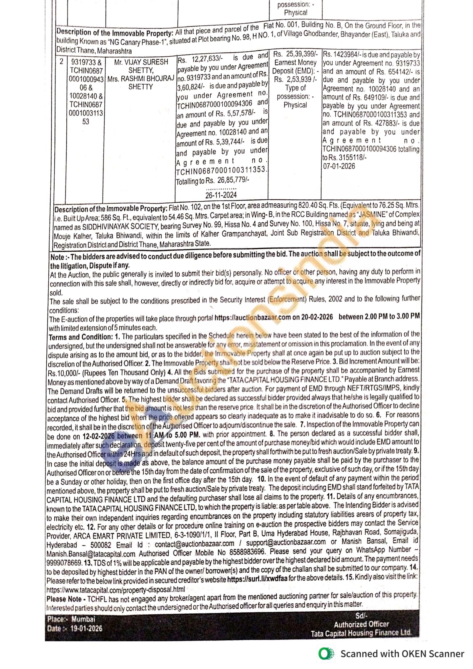 Flat No. 102, on the 1st Floor, area admeasuring 820.40 Sq. Fts. (Equivalent to 76.25 Sq. Mtrs. i.e. Built Up Area: 586 Sq. Ft., equivalent to 54.46 Sq. Mtrs. Carpet area; in Wing-B, in the RCC Building named as "JASMINE" of Complex named as SIDDHIVINAYAK SOCIETY, bearing Survey No. 99, Hissa No. 4 and Survey No. 100, Hissa No. 7, situate, lying and being at Mouje Kalher, Taluka Bhiwandi, within the limits of Kalher Grampanchayat, Joint Sub Registration District and Taluka Bhiwandi, Registration District and District Thane, Maharashtra State.