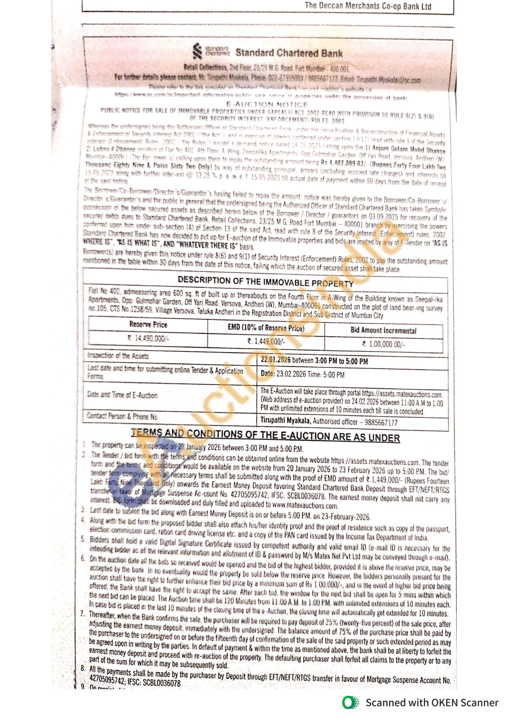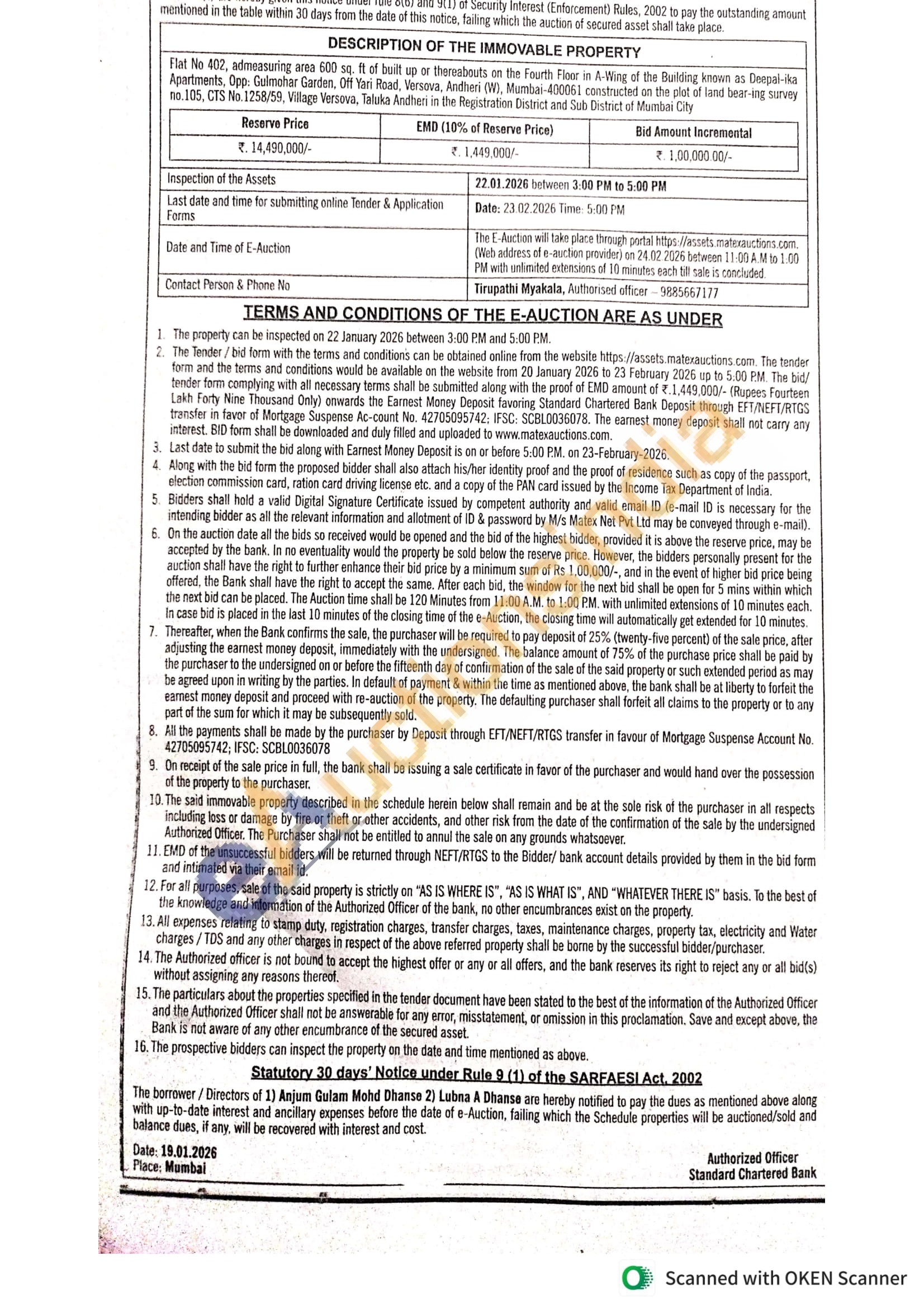 Flat Ne 402, admeasuring area 600 sq. ft of built up or thereabouts on the Fourth Floor in A-Wing of the Building known as Deepal-ika Apartments. Opp. Gulmohar Garden, Off Yari Road, Versova, Andheri (W), Mumbai-400061 constructed on the plot of land bear-ing survey no 105, CTS No.1258/59. Village Versova, Taluka Andheri in the Registration District and Sub District of Mumbai City