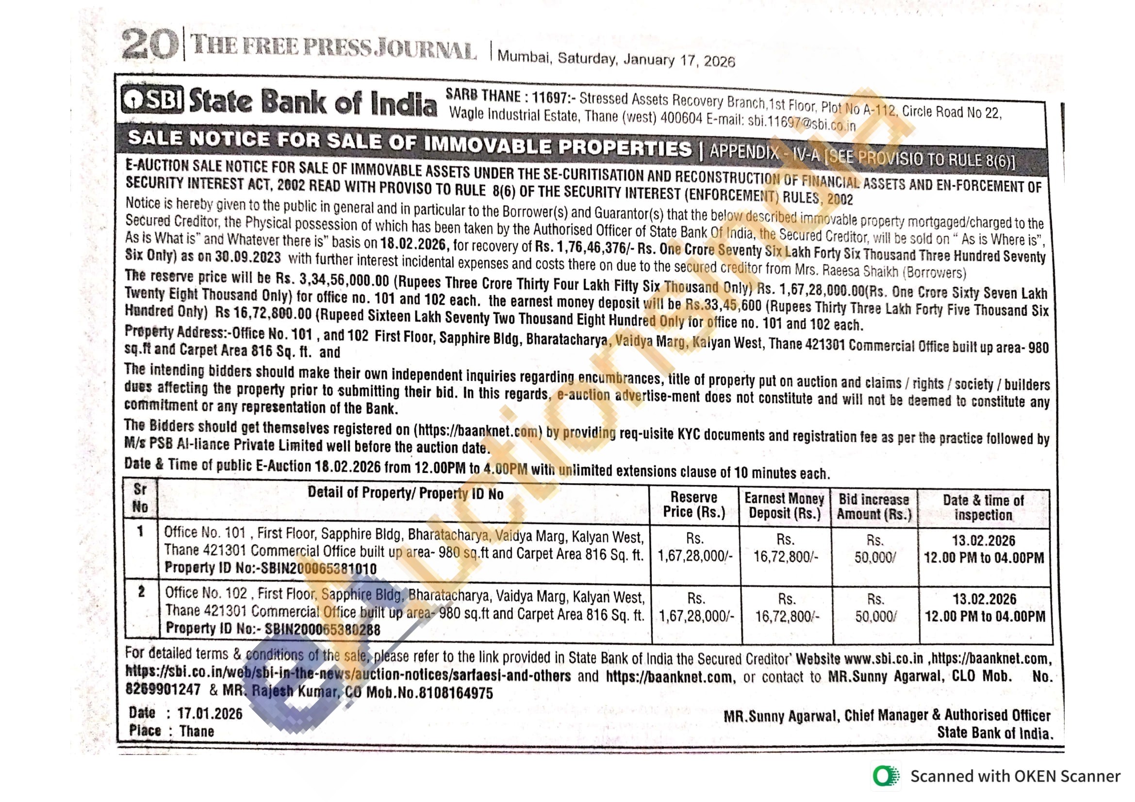 Office No. 102. First Floor, Sapphire Bldg, Bharatacharya, Vaidya Marg, Kalyan West, Thane 421301 Commercial Office built up area- 980 sq.ft and Carpet Area 816 Sq. ft. Property ID No:- SBIN200065380288