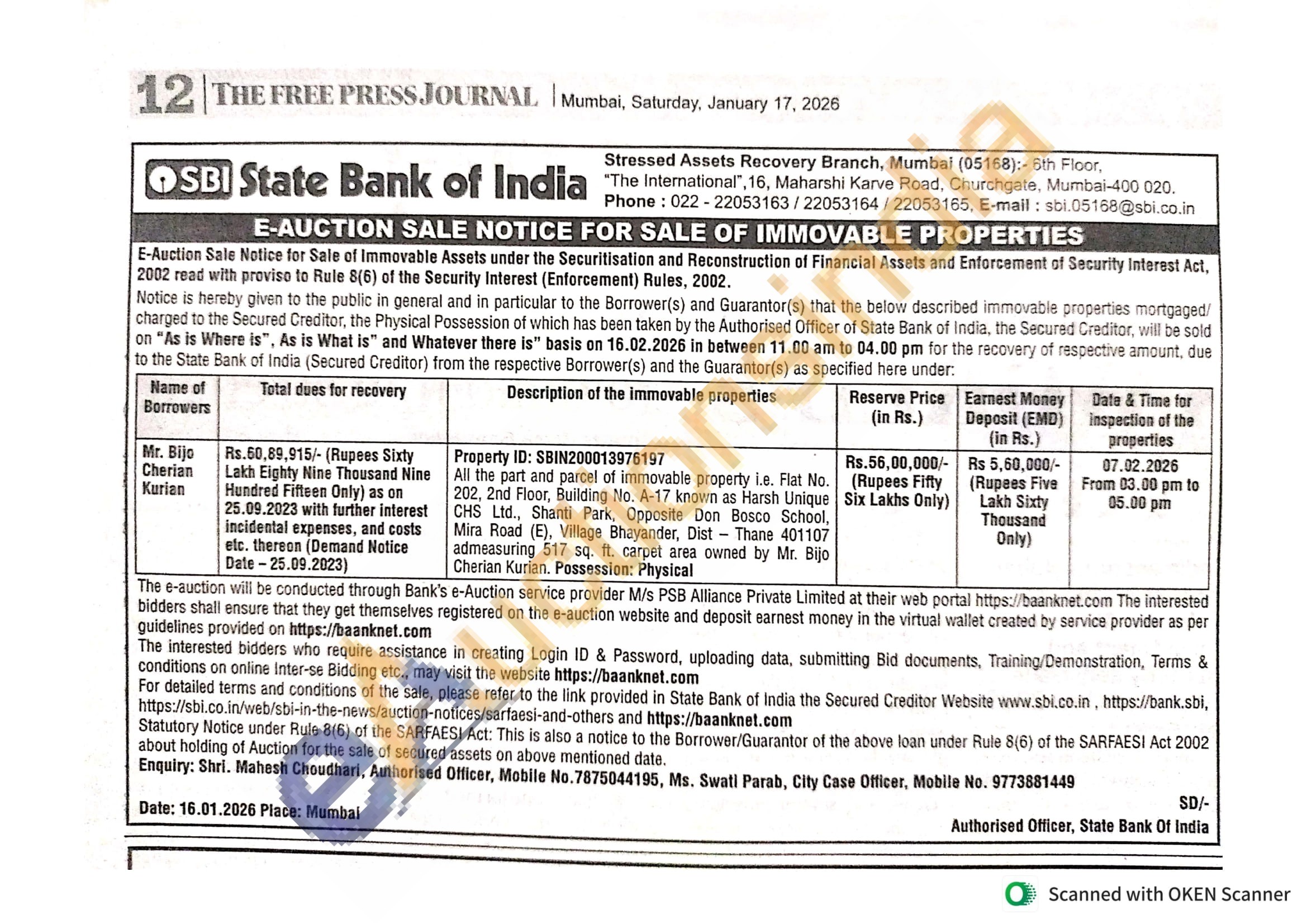 Property ID: SBIN200013976197 All the part and parcel of immovable property i.e. Flat No. 202, 2nd Floor, Building No. A-17 known as Harsh Unique CHS Ltd., Shanti Park, Opposite Don Bosco School, Mira Road (E), Village Bhayander, Dist Thane 401107 admeasuring 517 sq. ft. carpet area owned by Mr. Bijo Cherian Kurian. Possession: Physical