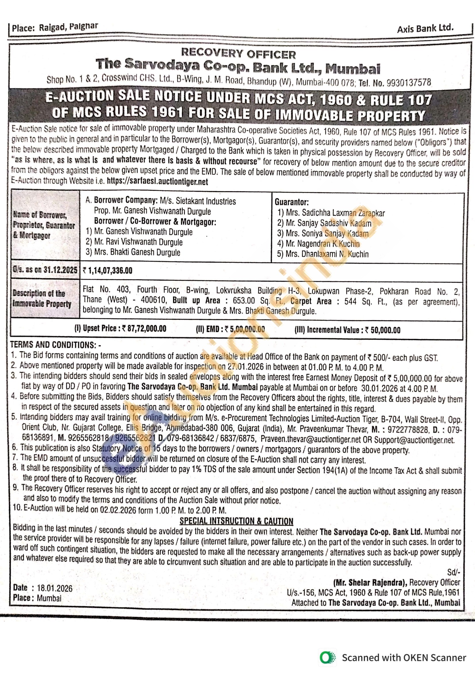 Flat No. 403, Fourth Floor, B-wing, Lokvruksha Building H-3, Lokupwan Phase-2, Pokharan Road No. 2. Thane (West) 400610, Bullt up Area: 653.00 Sq. Ft., Carpet Area: 544 Sq. Ft., (as per agreement). belonging to Mr. Ganesh Vishwanath Durgule & Mrs. Bhakti Ganesh Durgule.