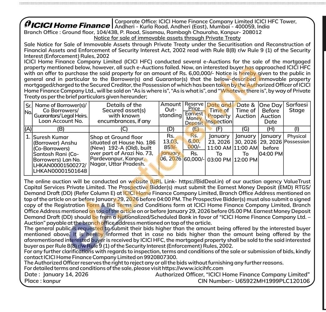 Shop at Ground floor situated at House No. 186 (New) 192-A (Old), built over part of Arazi No. 73, Pardevanpur, Kanpur, Nagar, Uttar Pradesh.
