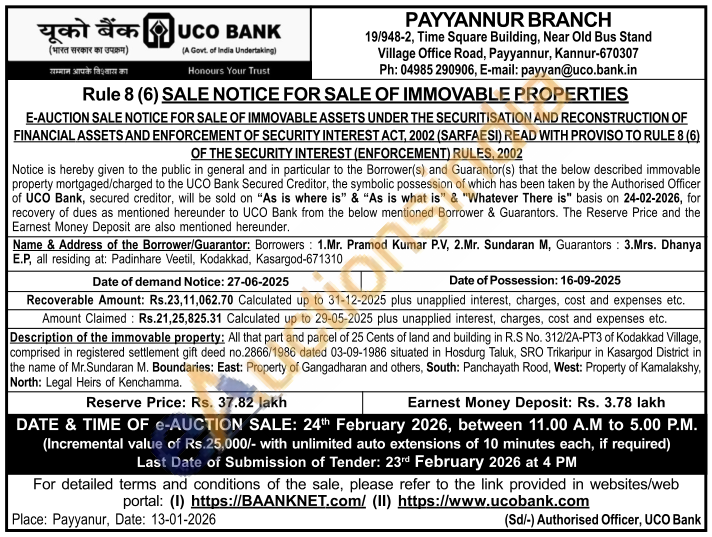 Description of the immovable property: All that part and parcel of 25 Cents of land and building in R.S No. 312/2A-PT3 of Kodakkad Village, comprised in registered settlement gift deed no.2866/1986 dated 03-09-1986 situated in Hosdurg Taluk, SRO Trikaripur in Kasargod District in the name of Mr.Sundaran M. Boundaries: East: Property of Gangadharan and others. South: Panchayath Rood, West: Property of Kamalakshy, North: Legal Heirs of Kenchamma