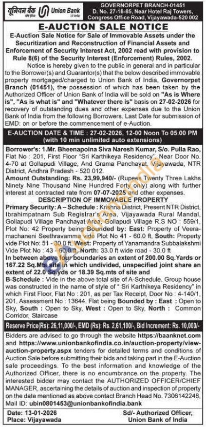 DESCRIPTION OF IMMOVABLE PROPERTY : Primary Security: A-Schedule: Krishna District, Present NTR District, Ibrahimpatnam Sub Registrar's Area, Vijayawada Rural Mandal, Gollapudi Village Panchayat Area, Gollapudi Village R.S NO: 559/1, Plot No: 42 Property being Bounded by: East: Property of Veera-machaneni Seethravamma vide Plot No 4160.0 ft, South: Property vide Plot No: 51-30.0 ft, West: Property of Yanamandra Subbalakshmi Vide Plot No: 43-60.0 ft, North: 33.0 ft wide road - 30.0 ft