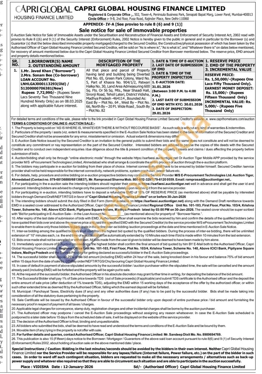 All that piece and parcel of Property having land and building being Diverted Plot No. 65, Green Park Colony, Ward No. 5, Part of Khasra No. 904/1/2, Patwari Halka No. 30, Land Area Admeasuring 600 Sq. Fts. Or 56 Sq. Mts., Near Shaadi Hall, Sironji Road, Tehsil Lateri, District Vidisha, Madhya Pradesh-464114, Bounded As: East By-Plot No. 64, West By-Plot No. 66, North By-20 Ft. Wide Road, South By -Plot No. 82