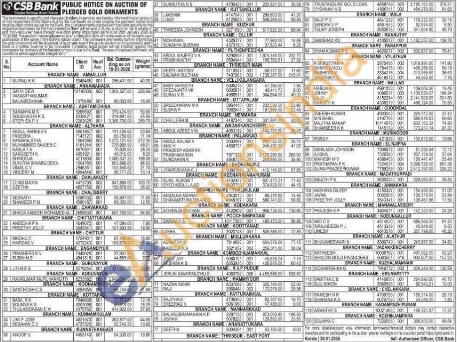 CSB Bank Gold Auctions Auction in Thrissur