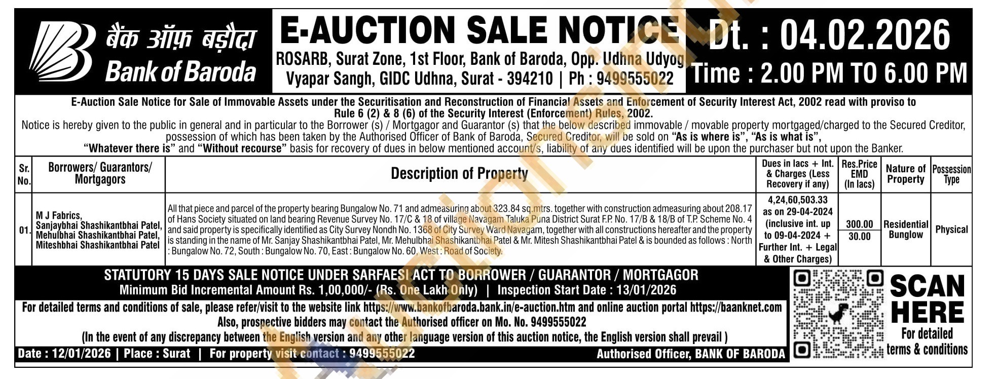 All that piece and parcel of the property bearing Bungalow No. 71 and admeasuring about 323.84 sq.mtrs. together with construction admeasuring about 208.17 of Hans Society situated on land bearing Revenue Survey No. 17/C & 18 of village Navagam Taluka Puna District Surat F.P. No. 17/B & 18/B of T.P Scheme No. 4 and said property is specifically identified as City Survey Nandh No. 1368 of City Survey Ward Navagam, together with all constructions hereafter and the property is standing in the name of Mr. Sanjay Shashikantbhai Patel, Mr. Mehulbhai Shashikantbhai Patel & Mr. Mitesh Shashikantbhai Patel & is bounded as follows: North Bungalow No. 72, South: Bungalow No. 70, East: Bungalow No. 60, West: Road of Society,