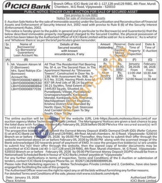 All That The Residential Flat Bearing No. Sf-4, on The Second Floor, In The Apartment Named As "Shivaram Towers", Constructed In Door No. 5-138, With Assessment No. 938, In R.S No. 312/6, Having Plinth Area of 837 Sft And Uds of 36.14 Sqyds or 30.21 Sq.Mtrs. Total Extent of Site 1445.83 Sq yds, Situated At Punadipadu Village, Punadipadu Gramapanchayathi, Kankipadu Mandal, Kankipadu Sub-Registrar, Machilipatnam District Registrar, Krishna District And Bounded By North: Open To Sky East: Staircase And Corridor West: Open To Sky South: Open To Sky