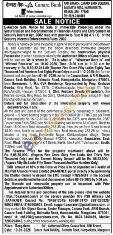 Details and full description of the Immovable property with known encumbrances, if any.: All the part and parcel of the commercial property consisting of basement. ground+5 floors bearing property Id No. 151600601901121077 (as per Form 3 new property No 16-12-1014-1), old khatha No. 2375, new khatha No. 2387 (as per form 3 it is 2389) site No. 4 measuring east to west 13.40 mtrs, North to South 18.90 mtrs Total measuring 253.35 sq. mtrs (as per form 3 east to west 18.90 mtrs, North to south 24.40 mtrs Total measuring 253.26 sq. mtrs.) located at ring road, Hemavathi Nagar, Chickandagola village, Thejur Panchayath, Hassan Block, Hassan 573201, Karnataka. Boundaries: East: Road, West: Site property of KT Girish, North: Site 3 of GT Vishwanath, South: 110 feet road