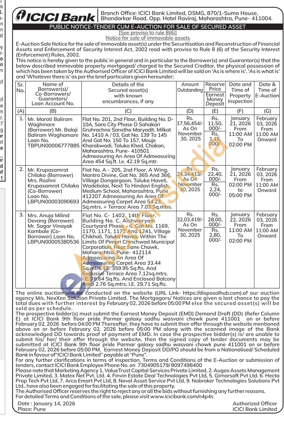Flat No. C-1402, 14th Floor, Building No. C. Aishwaryam Courtyard Phase II, Gat No. 1169, 1170, 1171, 1172 And 1241, Village Chikhali, Taluka Haveli, Within The Limits Of Pimpri Chinchwad Municipal Corporation, Near Sane Chowk, Maharashtra, Pune- 412114 Admeasuring An Area Of Admeasuring Carpet Area 33.44 Sq.mtrs. I.E. 359.95 Sq.fts. And Exclusive Terrace Area 7.12sq.mtrs. I.E. 76.64 Sq.fts. And Enclosed Balcony Area 2.76 Sq.mtrs. I.E. 29.71 Sq.fts.
