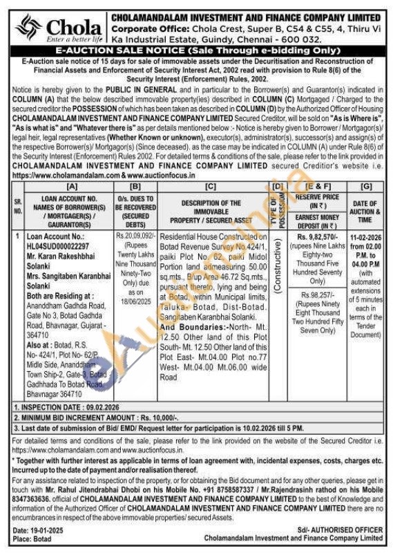 Residential House Constructed on Botad Revenue Survey No.424/1, paiki Plot No. 62. paiki Midol Portion land admeasuring 50.00 sq.mts., Blup Area 46.72 Sq.mts.. pursuant thereto, lying and being at Botad, within Municipal limits, Taluka Botad, Dist-Botad. Sangitaben Karanbhai Solanki. And Boundaries:-North- Mt. 12.50 Other land of this Plot South-Mt. 12.50 Other land of this Plot East- Mt.04.00 Plot no.77 West- Mt.04.00 Mt.06.00 wide Road