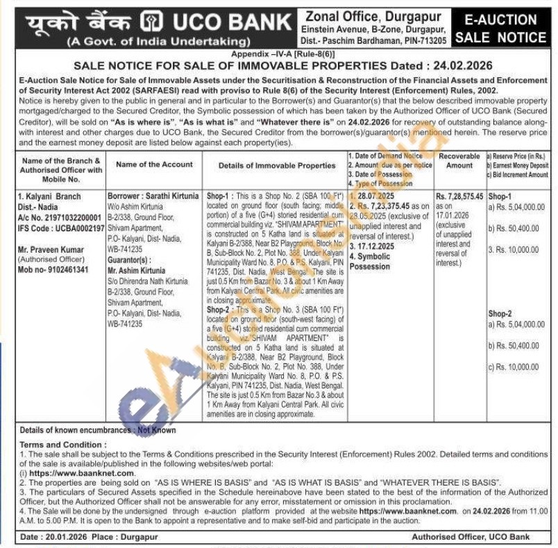 Shop-2: This is a Shop No. 3 (SBA 100 Ft) located on ground floor (south-west facing) of a five (G+4) storied residential cum commercial building viz. SHIVAM APARTMENT constructed on 5 Katha land is situated at Kalyani B-2/388, Near B2 Playground, Block No. B. Sub-Block No. 2. Plot No. 388, Under Kalyani Municipality Ward No. 8, P.O. & P.S. Kalyani, PIN 741235, Dist. Nadia, West Bengal. The site is just 0.5 Km from Bazar No.3 & about 1 Km Away from Kalyani Central Park. All civic amenities are in closing approximate is