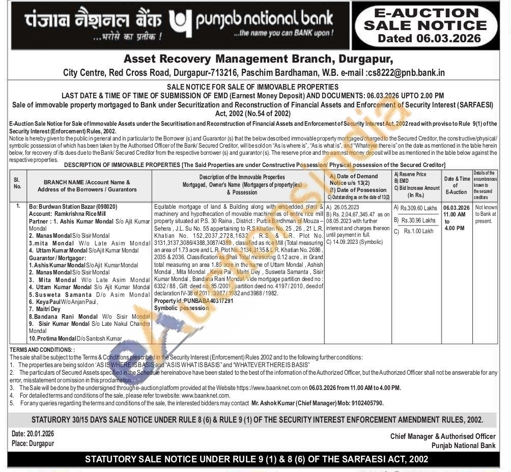 Equitable mortgage of land & Building along with embedded plant & machinery and hypothecation of movable machineries of entire rice mill property situated at P.S. 30 Raina, District: Purba Bardhman of Mouza-Sehera, J.L. Su No. 55 appertaining to R.S Khatian No. 25, 26, 21 L.R. Khatian No. 152,2037,2728,1632 R.S. & L.R. Plot No. 3131,3137,3086/4388,3087/4389, classified as rice Mill (Total measuring an area of 1.73 acre and L.R. Plot No. 3134,3135 & L.R. Khatian No. 2686, 2035 & 2036. Classification as Shali Total measuring 0.12 acre, in Grand total measuring an area 1,85 acre in the name of Uttam Mondal, Ashish Mondal, Mita Mondal, Keya Pal, Maitri Dey, Susweta Samanta, Sisir Kumar Mondal, Bandana Rani Mondal. Vide mortgage partition deed no: 6332/88, Gift deed no. 85/2001, partition deed no. 4197/2010, deed of declaration IV-38 of 2011, 3987/1982 and 3988/1982.