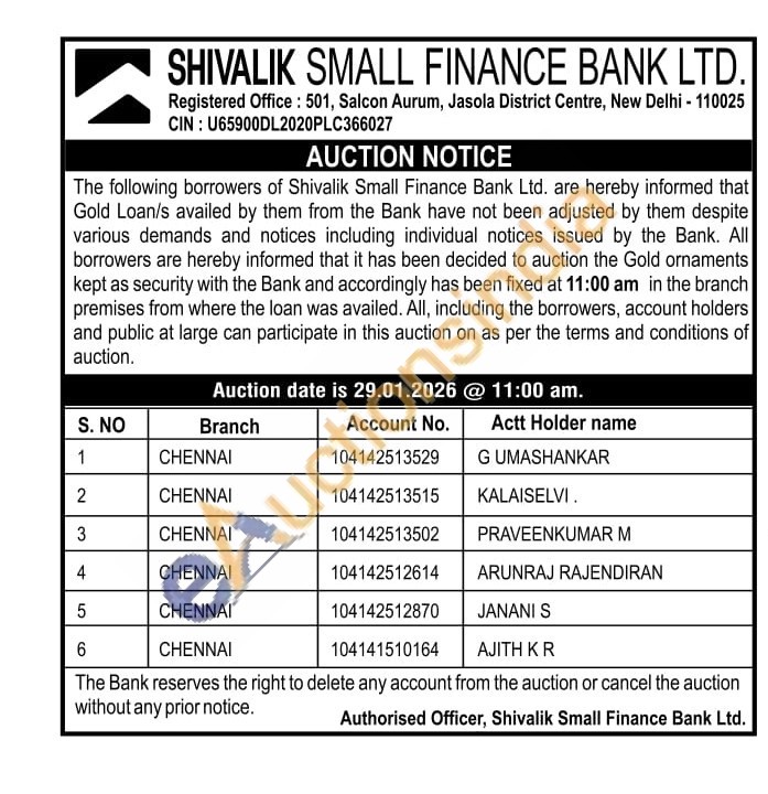 Shivalik Small Finance Bank Ltd Gold Auctions Auction in New Delhi