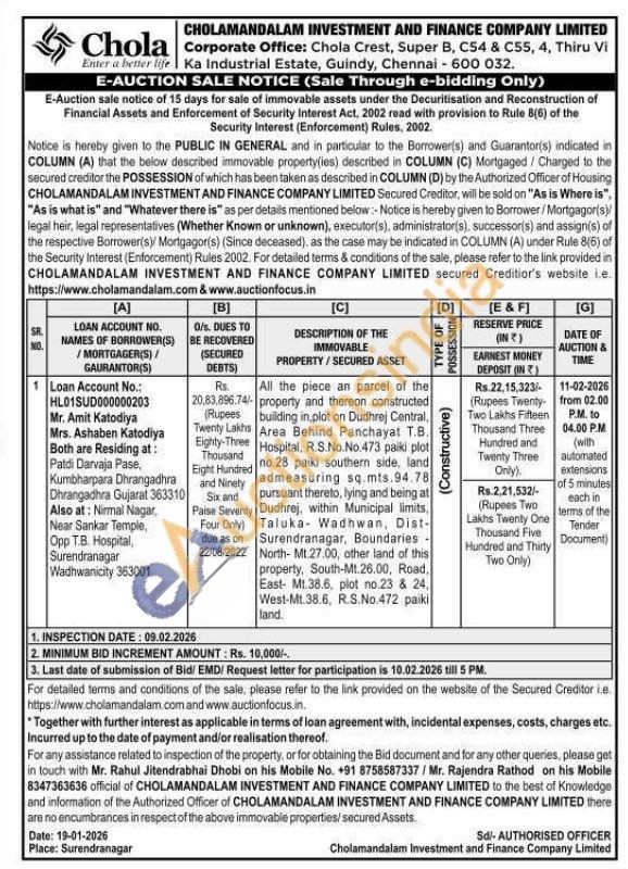 All the piece an parcel of the property and thereon constructed building in plot on Dudhrej Central, Area Behind Panchayat T.B. Hospital, R.S.No. No.473 paiki plot no.28 paiki southern side, land admeasuring sq.mts.94.78 pursuant thereto, lying and being at Dudhrej, within Municipal limits, Taluka Wadhwan, Dist-Surendranagar, Boundaries -North-Mt.27.00, other land of this property, South-Mt.26.00, Road, East- Mt.38.6, plot no.23 & 24, West-Mt.38.6, R.S.No.472 paiki land.