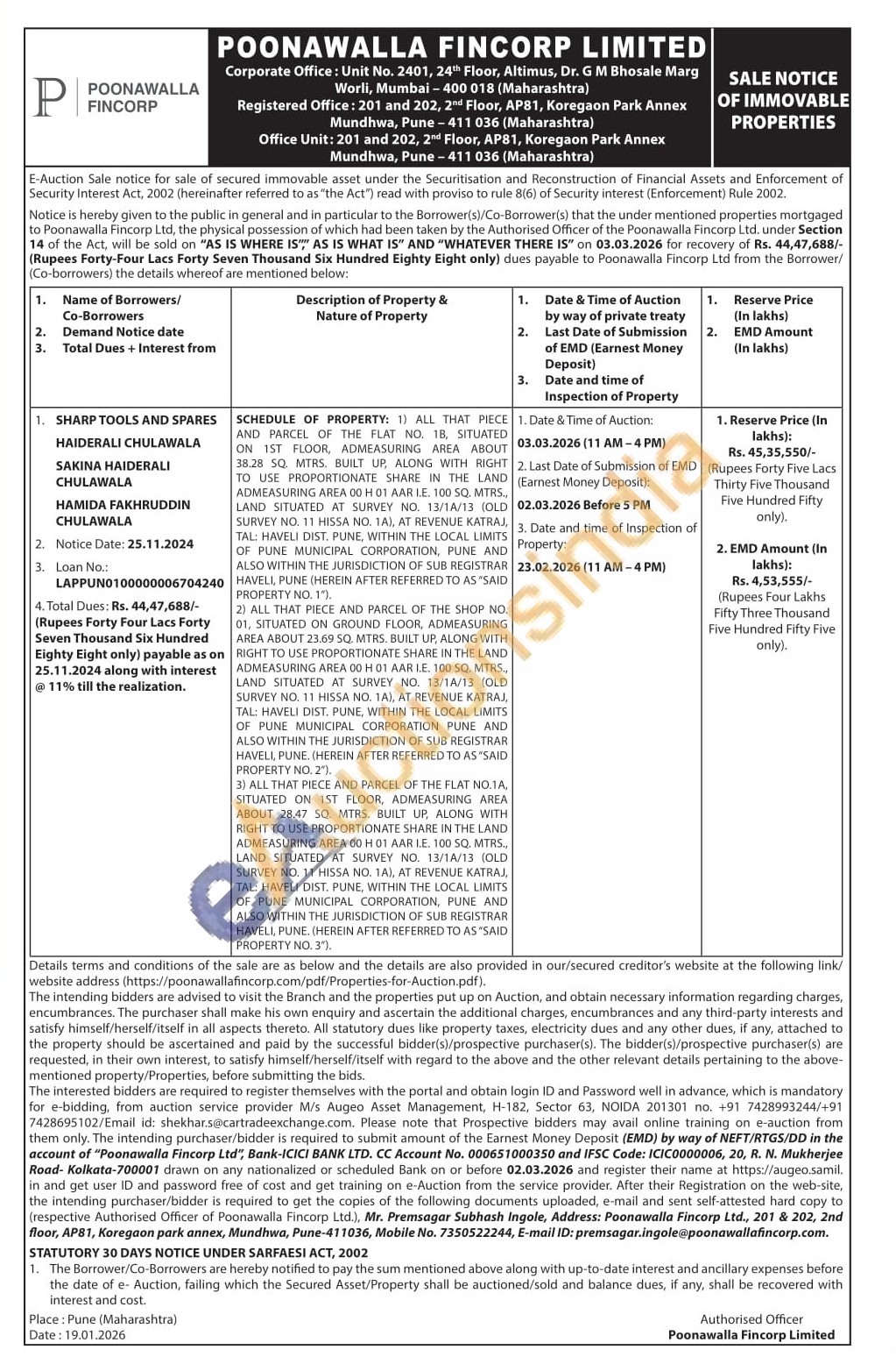 SCHEDULE OF PROPERTY: 1) ALL THAT PIECE AND PARCEL OF THE FLAT NO. 18, SITUATED ON 1ST FLOOR, ADMEASURING AREA ABOUT 38.28 SQ. MTRS. BUILT UP, ALONG WITH RIGHT TO USE PROPORTIONATE SHARE IN THE LAND ADMEASURING AREA 00 H 01 AAR IE 100 SQ. MTRS, LAND SITUATED AT SURVEY NO. 13/14/13 (OLD SURVEY NO. 11 HISSA NO. 1A), AT REVENUE KATRAL TAL HAVELI DIST. PUNE, WITHIN THE LOCAL LIMITS PROPERTY NO. 11 OF PUNE MUNICIPAL CORPORATION, PUNE AND ALSO WITHIN THE JURISDICTION OF SUB REGISTRAR HAVELL, PUNE