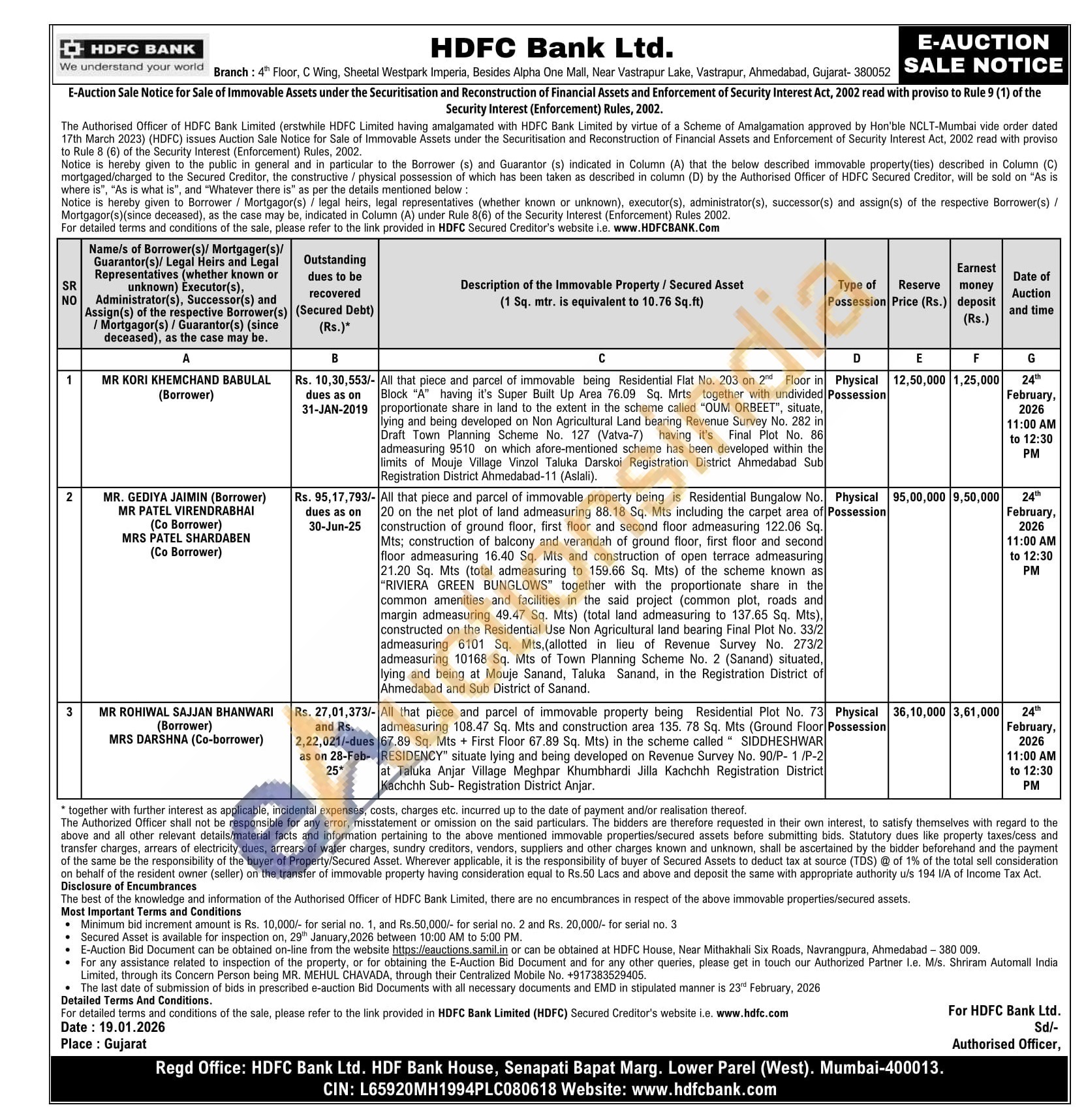 All that piece and parcel of immovable being Residential Flat No. 203 on 2nd Floor in proportionate share in land to the extent in the scheme called "OUM ORBEET, situate, Block "A" having it's Super Built Up Area 76.09 Sq. Mrts together with undivided lying and being developed on Non Agricultural Land bearing Revenue Survey No. 282 in Draft Town Planning Scheme No. 127 (Vatva-7) having it's Final Plot No. 86 admeasuring 9510 on which afore-mentioned scheme has been developed within the limits of Mouje Village Vinzol Taluka Darskoi Registration District Ahmedabad Sub Registration District Ahmedabad-11 (Aslali).