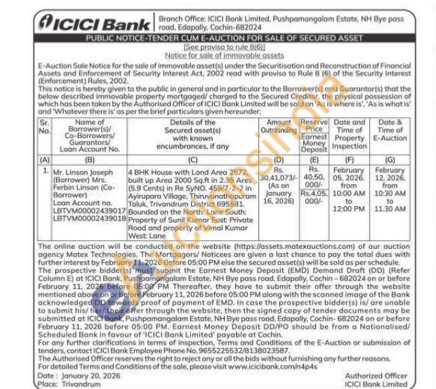 4 BHK House with Land Area 2572, built up Area 2000 Sq.ft in 2.39 Ares (5.9 Cents) in Re SyNO. 459/7-2-2 in Ayirupara Village, Thiruvanathapuram Taluk, Trivandrum District 695581. Bounded on the North: Lane South: Property of Sunil Kumar East: Private Road and property of Vimal Kumar West: Lane