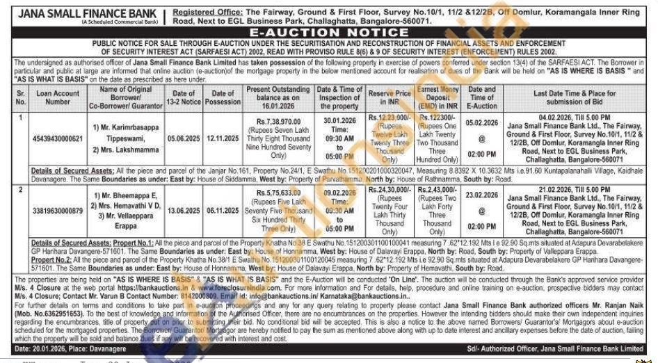 Details of Secured Assets: Propert No.1: All the piece and parcel of the Property Khatha No.38 E Swathu No.151200301100100041 measuring 7.62 12.192 Mts le 92.90 Sq.mts situated at Adapura Devarabelakere GP Harihara Davangere-571601. The Same Boundaries as under: East by: House of Honnamma, West by: House of Dalavayi Erappa, North by: Road, South by: Property of Valleppara Erappa Propert No.2: All the piece and parcel of the Property Khatha No.38/1 E Swathu No. 151200301100120045 measuring 7.62*12.192 Mts ie 92.90 Sq.mts situated at Adapura Devarabelakere GP Harihara Davangere 571601. The Same Boundaries as under: East by: House of Honnamma, West by: House of Dalavayı Erappa, North by: Property of Hemavathi, South by: Road.