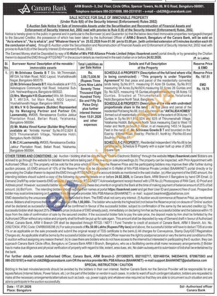 Authorised Officer, Canara Bank, ARM Branch-2- (9113092975, 8921102717, 9201460154, 9483544116, 8709675503