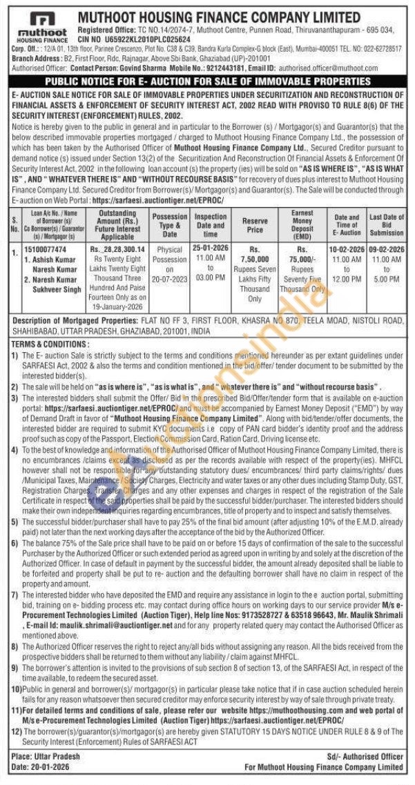Description of Mortgaged Properties: FLAT NO FF 3, FIRST FLOOR, KHASRA NO 870, TEELA MOAD, NISTOLI ROAD, SHAHIBABAD, UTTAR PRADESH, GHAZIABAD, 201001, INDIA