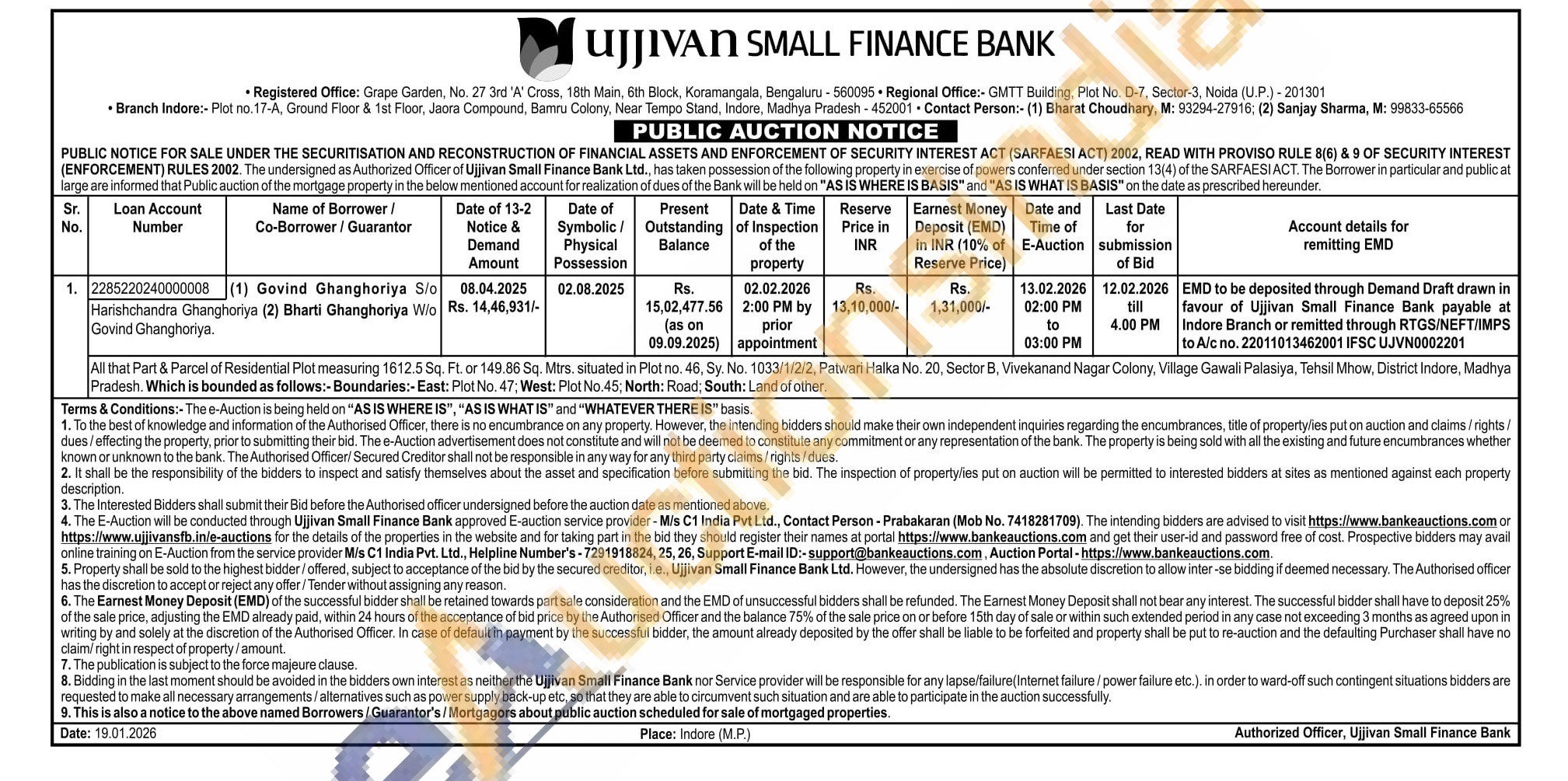 All that Part & Parcel of Residential Plot measuring 1612.5 Sq. Ft. or 149.86 Sq. Mirs. situated in Plat no. 46, Sy. No. 1033/1/2/2, Patwari Halka No. 20, Sector B, Vivekanand Nagar Colony, Village Gawali Palasiya, Tehsil Mhow, District Indore, Madhya Pradesh. Which is bounded as follows:-Boundaries:-East: Plot No. 47. West: Plot No.45; North: Road; South: Land of other