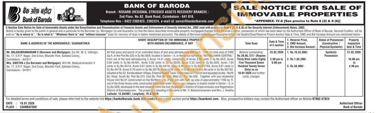 All that piece and parcel of an undivided share of plot orea admeasuring 800 Sqft, from the total area of 2400 Soft, at the Plot No.525 in Sy No.5016, located in Sector-5, in the layout named as "MAHINDHARA CENTRAL from out of the land admeasuring ) Acres 14.41 cents, comprising of Acres 2.05 cents in Sy.No.44/3, Acres 0.84 cents in Sy.No.44/441, Acres 0.50 cents in Sy No 50/20 Acres 2.53 cents in Sy No.50/6, Acres 1.64 cants in Sy No 44/TA, Acres 0.61 cents in Sy.No 44/TA, Acres 0.46 cents in Sy No 50/743, Acres 0.61 cents in Sy No.44/18. Acres 0.70 cents in Sy No: 50//8, Acres 4:00 oents in Sy No.50/1H and 46 cents in Sy No: 50/742 situated at No. 52, Kondasakkam Village, Sriperambodur Taluk, Kancheepuram District and bounded on North By: Road, South By: Plot No.515, East By: Plot No. 524, West By Plot Ro.520. Together with one residential House Unit No.01 constructed on the Northern side of the plot with built up area of approximately 1100 sq ft out of the three house units constructed theroupon under row houses category in duplex moded in Sectr Sy No.5016. developed in the land situated within the Sub-Registration District of Sriperumbudur and Registration District of Kancheepuram. The property a standing in the name of Mr. V. Balasubramaniam and Mrs. Swetha Latitude: 13.043961, Longitude: 79.8975029