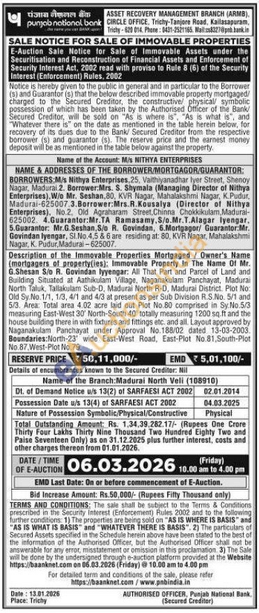 Description of the Immovable Properties Mortgaged / Owner's Name (mortgagers of property(ies): Immovable Property In The Name Of Mr. G.Shesan S/o R. Govindan lyyengar: All That Part and Parcel of Land and Building Situated at Aathikulam Village, Naganakulam Panchayat, Madurai North Taluk, Tallakulam Sub-D, Madurai North R-D, Madurai District. Plot No: Old Sy.No.1/1, 1/3, 4/1 and 4/3 at present as per Sub Division R.S.No. 5/1 and 5/3. Area: Total area 4.02 acre laid out Plot No.80 comprised in Sy.No.5/3 measuring East-West 30° North-South 40 totally measuring 1200 sq.ft and the house building there in with fixtures and fittings etc. and all. Layout approved by Naganakulam Panchayat under Approval No.188/02 dated 13-03-2003. Boundaries:North-23' wide East-West Road, East-Plot No.81, South-Plot No.87, West-Plot No.79