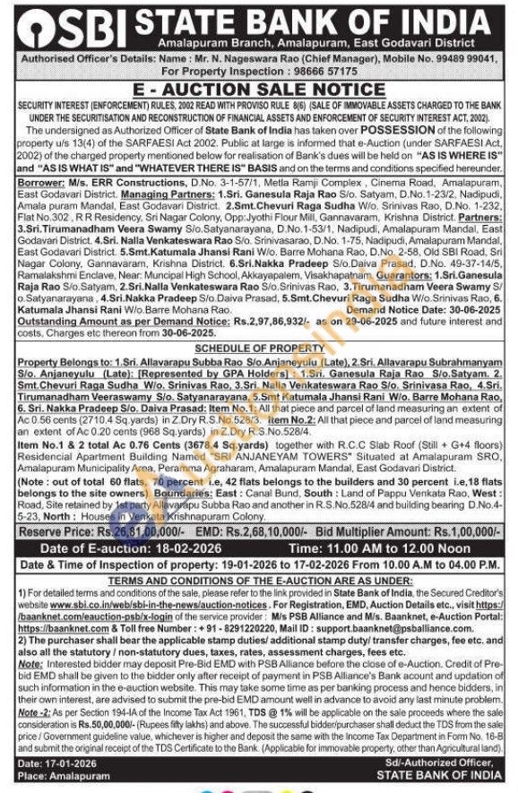Item No.1: All that piece and parcel of land measuring an extent of Ac 0.56 cents (2710.4 Sq.yards) in Z.Dry R.S.No.528/3. Item No.2: All that piece and parcel of land measuring an extent of Ac 0.20 cents (968 Sq.yards) in Z.Dry R.S.No.528/4.Item No.1 & 2 total Ac 0.76 Cents (3678.4 Sq.yards) together with R.C.C Slab Roof (Still+G+4 floors) Residencial Apartment Building Named "SRI ANJANEYAM TOWERS" Situated at Amalapuram SRO, Amalapuram Municipality Area, Peramma Agraharam, Amalapuram Mandal, East Godavari District.(Note: out of total 60 flats, 70 percent i.e, 42 flats belongs to the builders and 30 percent i.e, 18 flats belongs to the site owners). Boundaries: East: Canal Bund, South: Land of Pappu Venkata Rao, West: Road, Site retained by 1st party Allavarapu Subba Rao and another in R.S.No.528/4 and building bearing D.No.4-5-23, North: Houses in Venkata Krishnapuram Colony.