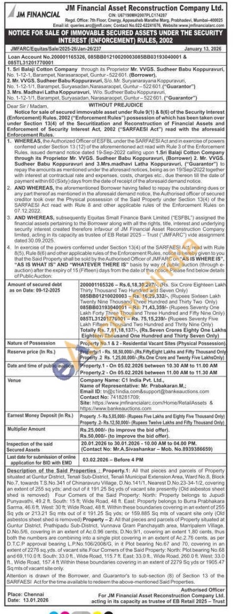 Property-2: All that pieces and parcels of Property situated at Guntur District, Prathipadu Sub-District, Vunnava Gram Panchayath area, Maripalem Village. D.No.5/6, covering in an extent of Ac 0.06 cents. D.No.9/1, covering an extent 1.80 cants, thus both the numbers are combining into a single piot covering in an extent of Ac 2.76 cents, as per DTC.P approval bearing LPNo.106/2008/G, in it Plot bearing No.67 and 70, covering in an extent of 2276 sq yds of vacant site Four Corners of the Said Property: North: Plot bearing No.88 and 69,110.0 ft. South: 33.01, Wide Road, 115.7h. East 33.0ft, Wide Road, 260.0 ft. West: 33.0 Wide Road, 1574 ft Within these boundaries covering in an extent of 2279 8q yds or 1905.47 Sq mbs of vacant sits only