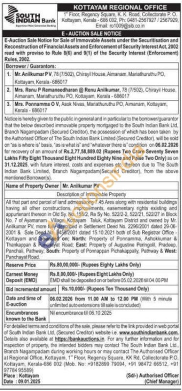 All that part and parcel of land admeasuring 7.45 Ares along with residential buildings having all other constructions, improvements, easementary rights existing and appurtenant thereon in Old Sy. No. 155/2, Re Sy No. 522/2-2, 522/21, 522/27 in Block No. 7 of Ayamanam Village, Kottayam Taluk, Kottayam District and owned by Mr. Anilikumar PV, more fully described in Settlement Deed No. 2296/2001 dated 29-06-2001 & Sale Deed No. 3458/2001 dated 15.10.2021 both of Sub Registrar Office-Kottayam and bounded on: North: Property of Ponnamma, Ashokkumar & Thankappan & Panchayat Road, East: Property of Augustine Peringoll, Pradeep, Panchall, Pathway, South: Property of Ponnappan Pichakappally, Pathway & West: Panchayat Road