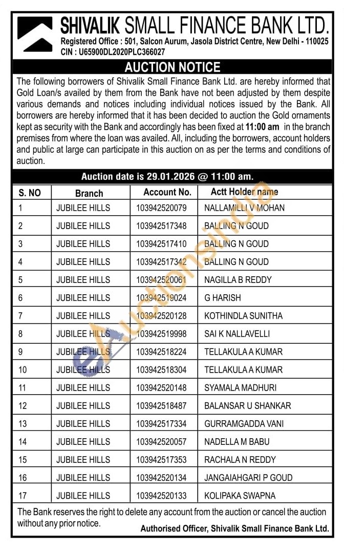 Shivalik Small Finance Bank Ltd Gold Auctions Auction in New Delhi