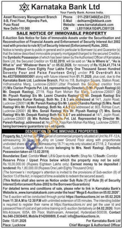 Property No. 1: All that part and parcel of commercial property situated at Unit No. FF-12A, admeasuring 30.76 sq.mts, only on Lower Ground Floor along with proportionate undivided share in the land admeasuring 18.71 sq.mts only situated at 27/18, 2. Faizabad Road, Lucknow at Landmark Arcade belonging to Mrs. Neeti Rastogi. (Symbolic Possession taken on 13.02.2019)