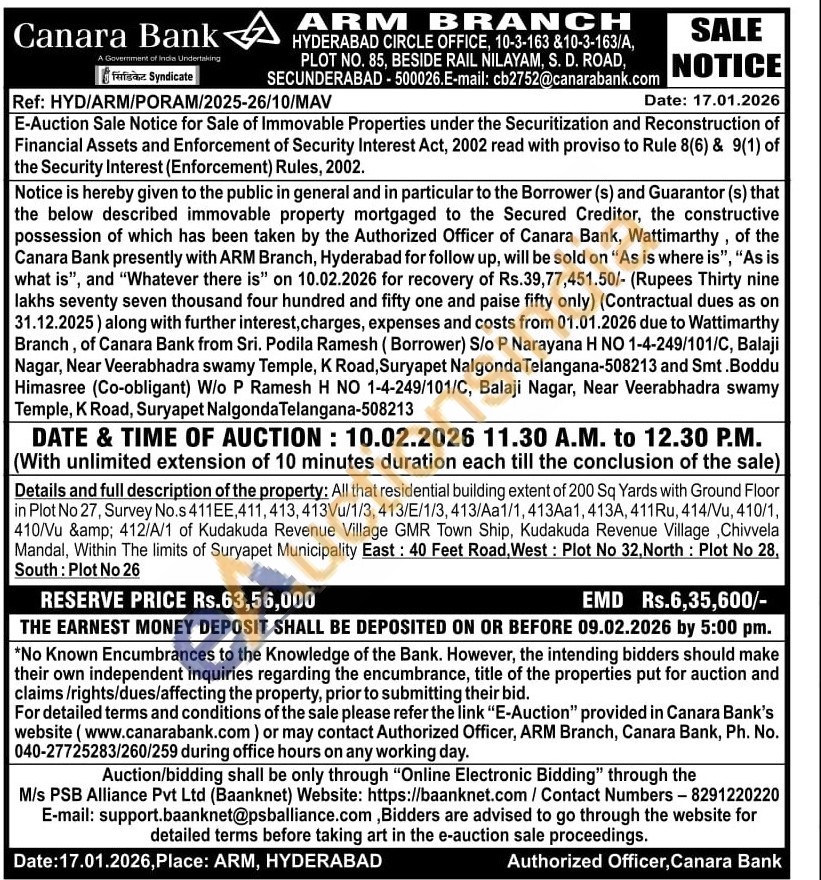 Details and full description of the property: All that residential building extent of 200 Sq Yards with Ground Floor in Plot No 27, Survey No.s 411EE, 411, 413, 413Vu/1/3, 413/E/1/3, 413/Aa1/1, 413Aa1, 413A, 411Ru, 414/Vu, 410/1, 410/Vu & 412/A/1 of Kudakuda Revenue Village GMR Town Ship, Kudakuda Revenue Village, Chivvela Mandal, Within The limits of Suryapet Municipality East: 40 Feet Road, West: Plot No 32, North: Plot No 28, South: Plot No 26