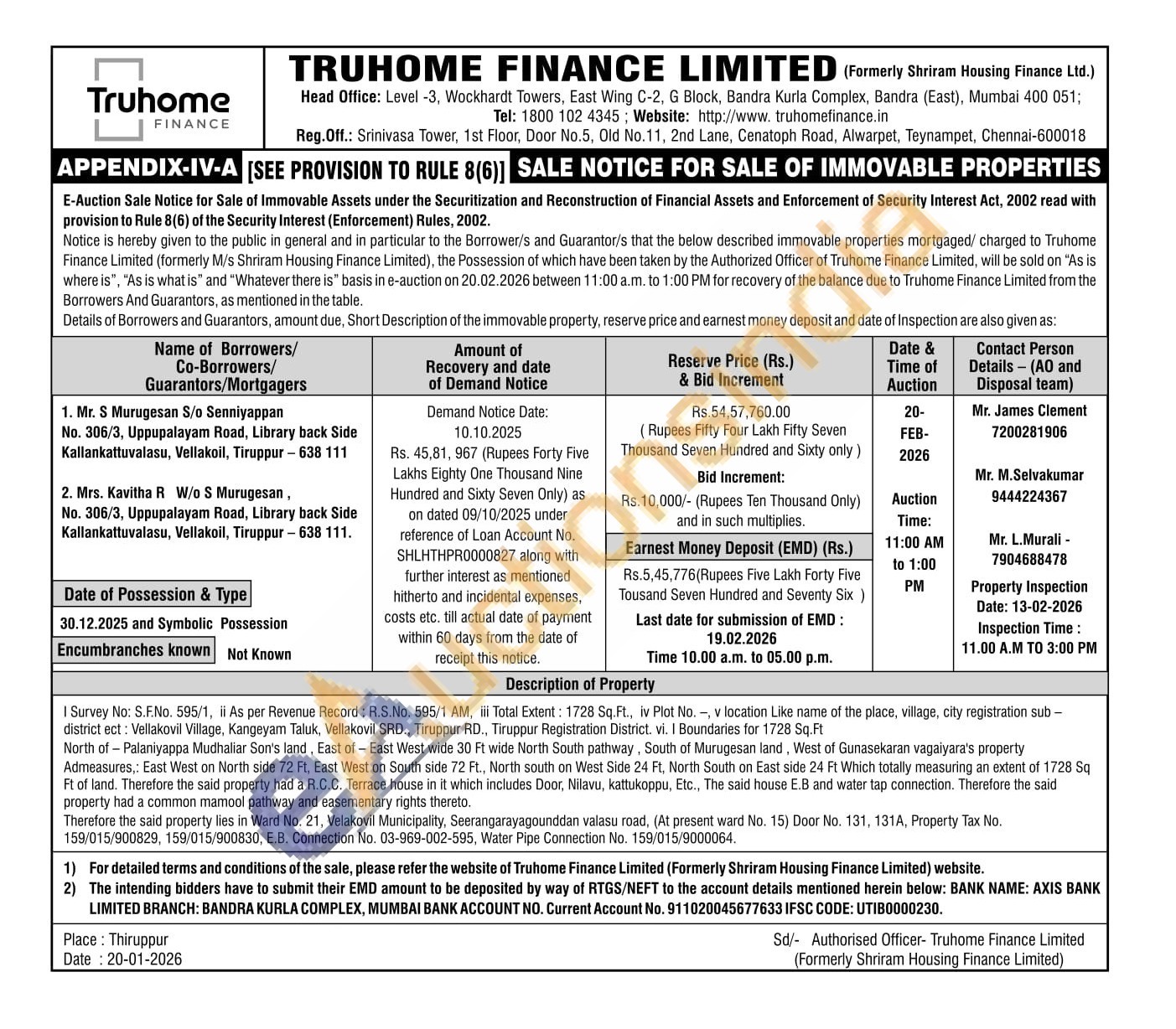 Survey No: S.F.No. 595/1, ii As per Revenue Record: R.S.No. 595/1 AM, ili Total Extent: 1728 Sq.Ft., iv Plot No. -, v location Like name of the place, village, city registration sub -district ect: Vellakovil Village, Kangeyam Taluk, Vellakovil SRD., Tiruppur RD., Tiruppur Registration District. vi. I Boundaries for 1728 Sq.Ft North of Palaniyappa Mudhaliar Son's land, East of East West wide 30 Ft wide North South pathway, South of Murugesan land, West of Gunasekaran vagaiyara's property Admeasures,: East West on North side 72 Ft, East West on South side 72 Ft., North south on West Side 24 Ft, North South on East side 24 Ft Which totally measuring an extent of 1728 Sq Ft of land. Therefore the said property had a R.C.C. Terrace house in it which includes Door, Nilavu, kattukoppu, Etc., The sald house E.B and water tap connection. Therefore the said property had a common mamool pathway and easementary rights thereto. Therefore the said property lies in Ward No. 21, Velakovil Municipality, Seerangarayagounddan valasu road, (At present ward No. 15) Door No. 131, 131A, Property Tax No. 159/015/900829, 159/015/900830, E.B. Connection No. 03-969-002-595, Water Pipe Connection No. 159/015/9000064.