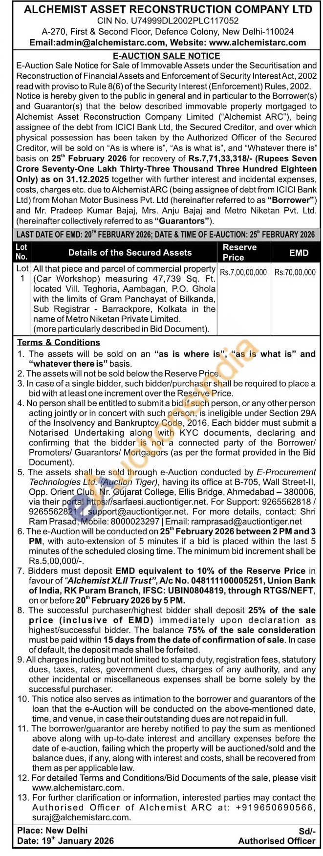 All that piece and parcel of commercial property (Car Workshop) measuring 47,739 Sq. Ft. located Vill. Teghoria, Aambagan, P.O. Ghola with the limits of Gram Panchayat of Bilkanda, Sub Registrar Barrackpore, Kolkata in the name of Metro Niketan Private Limited.