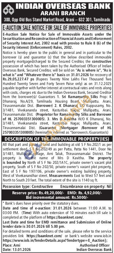 All that part and parcel of land and building at old SF No.202/1 as per settlement deed, SF No 202/49 as per Patta, Patta No 1441, Door No 3/1481, Mullipattu village, Arni Taluk, Thiruvannamalai District. The property is in the name of Mrs D Kavitha. The property is bounded by North of SF No 202/1A1C, private owner's vacant plot property, South of S F No 202/50, private owner's vacant plot property, East of SF No 197/106, private owner's existing building property, West of Vivekanandhar street. Measurements East to West 57 feet and North to South 20 feet. The total extent of the site is 1140 sq ft